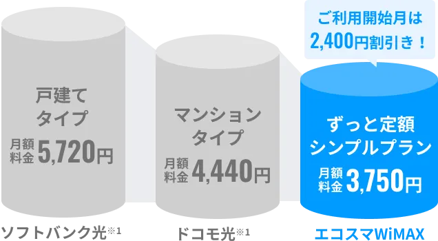 エコスマWiMAXの「シンプルプラン」では、業界最安級月額3,750円※1でWiMAXがご利用いただけます。シンプルな料金体系でずっと変わらない定額制。長期間ご利用される方には特におすすめです。さらに初月は最大で2,630円の割引※2でお得に始めることが可能です。