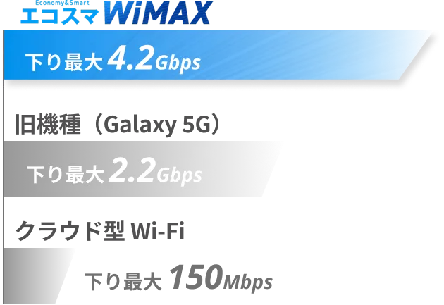 エコスマWiMAXは、auの5G回線※1・4GLTE・WiMAX2+のモバイル回線をエリアに応じて利用することが可能です。対応機器は下り最大4.2Gbps※2の最新WiMAX端末です。従来の機器と比べて最大通信速度が向上しているので、ストレスなくインターネットをご利用いただけます。
